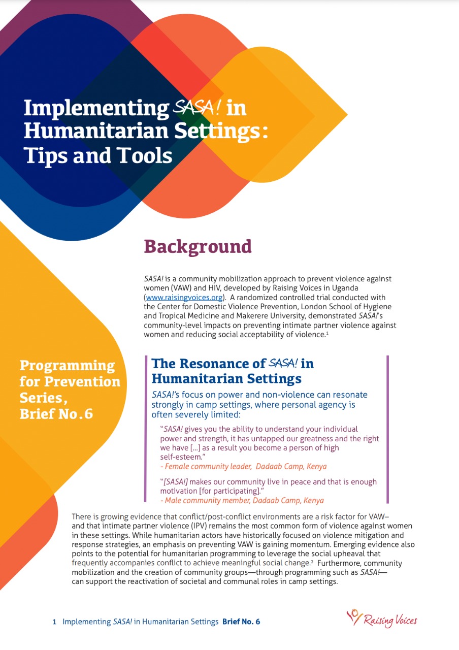 SASA! includes practical resources, activities and monitoring and assessment tools for local activism, media and advocacy, communication materials and training that organizations working on violence or HIV/AIDS can use to incorporate these cross-cutting issues into their work.